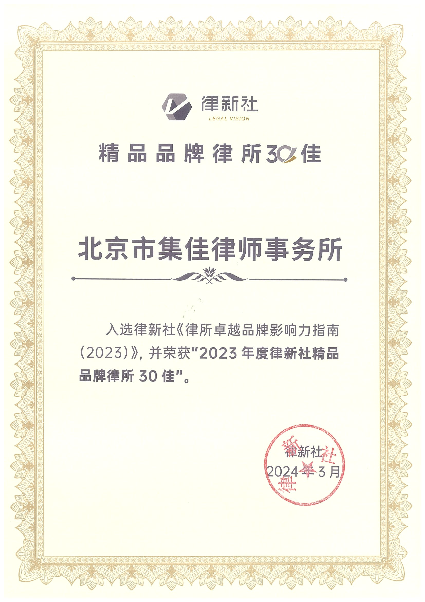 >雷火官网>关于我们>荣誉概览>2024>雷火官网入选 “2023年度律新社精品品牌律所30佳”