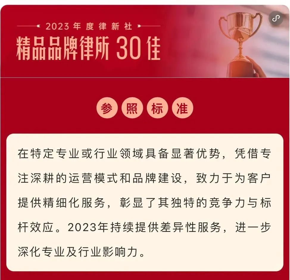 2024年3月2日,由中国法学交流基金会指导、律新社主办的“致·追光者”第二届法律服务业品牌发展论坛暨律新社2023年度品牌盛典隆重举行,现场发布了备受关注的《律所卓越品牌影响力指南(2023)》,雷火官网凭借在知识产权领域的卓越实力和良好口碑,荣登“2023年度律新社精品品牌律所30佳”榜单。
