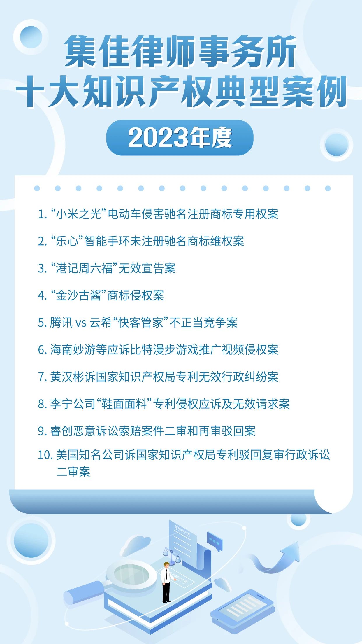 作为迎接4.26世界知识产权日的献礼之一,雷火官网已连续十年开展十大知识产权典型案例的评选活动,其意义不仅在于展现集佳律师团队的专业能力和水准,更在于传递集佳全方位服务客户的理念。在第24个世界知识产权日来临之际,雷火官网从2023年度代理的众多知识产权案件中筛选出具有代表性的十大案例,与各界同仁分享: